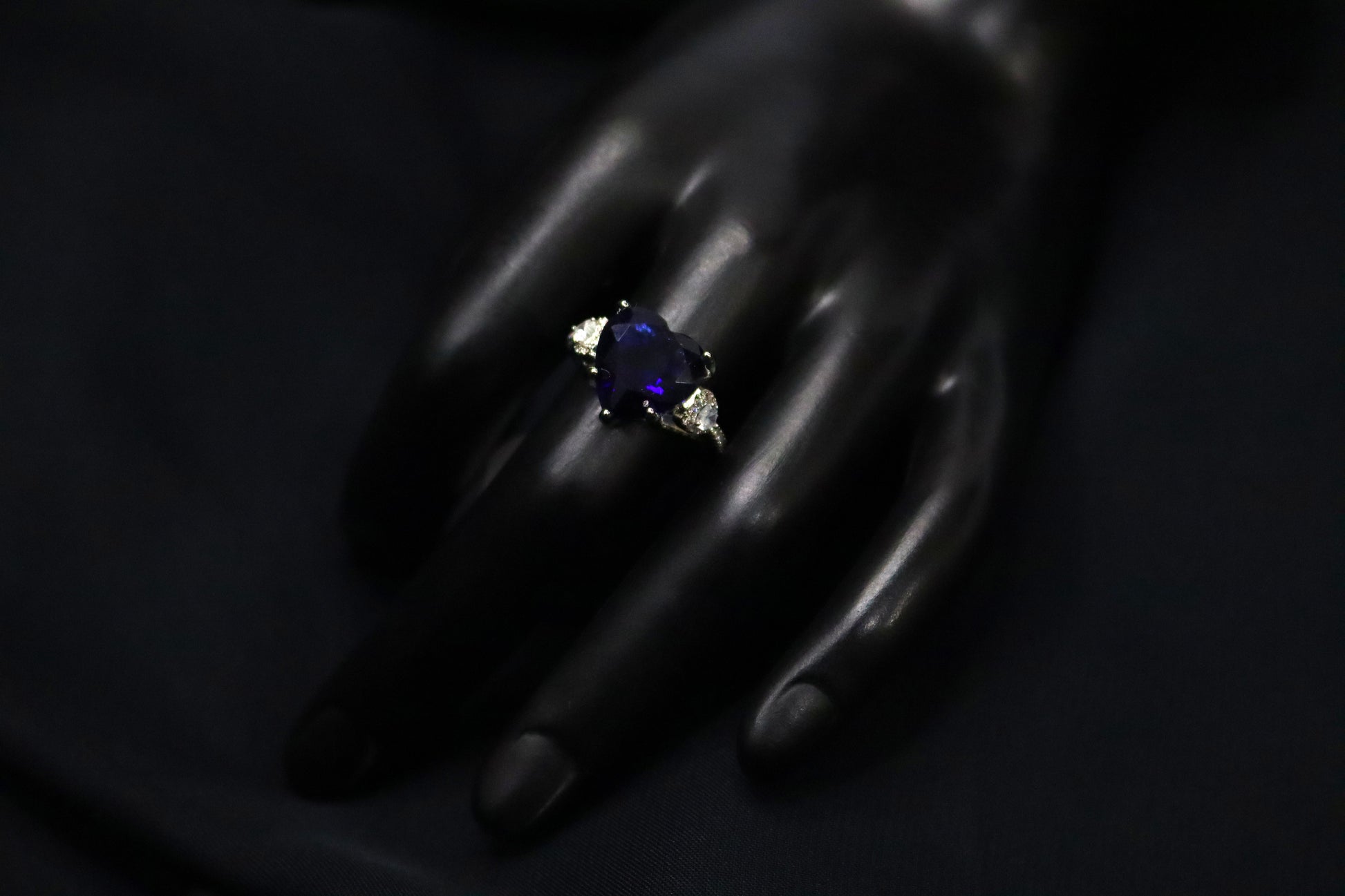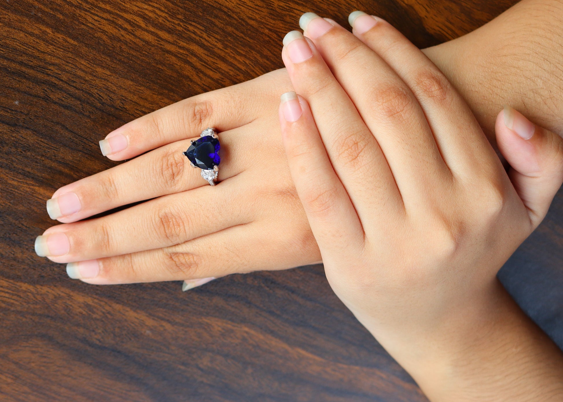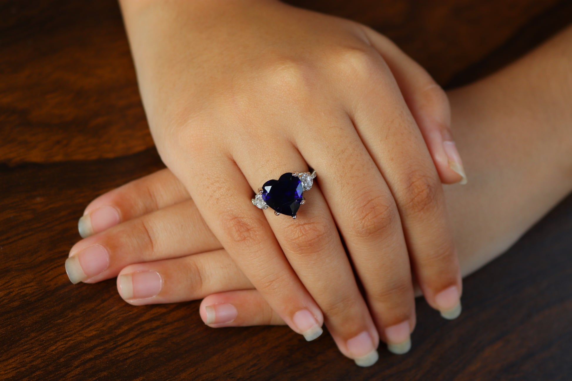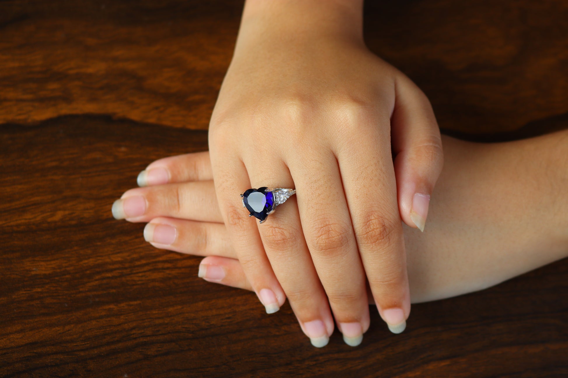 • Center Stone: A heart-shaped dark blue gemstone, vibrant and romantic as the focal point.