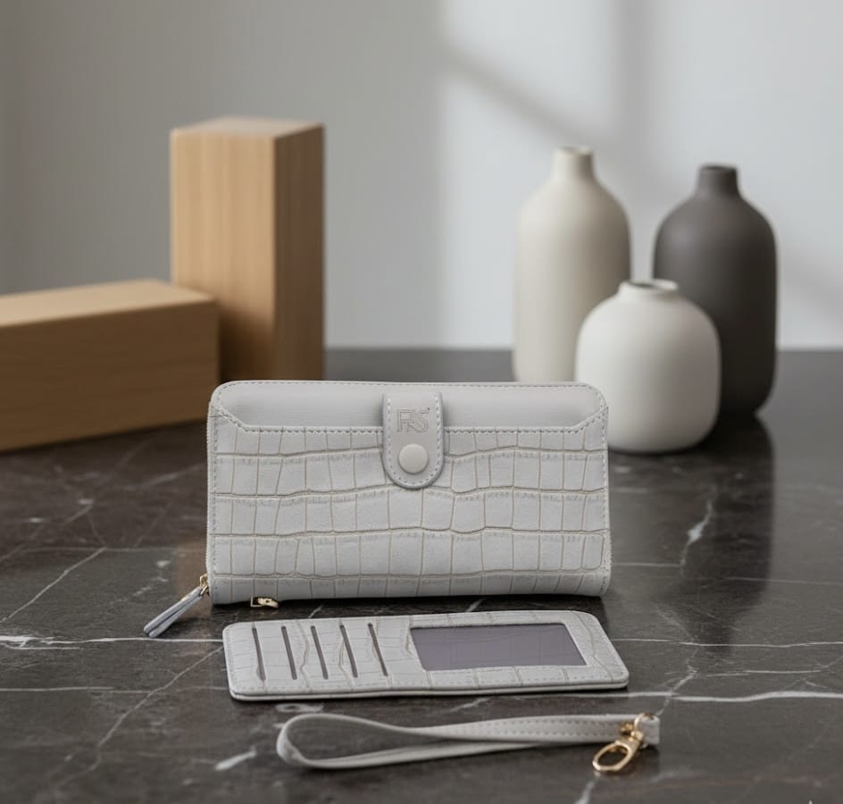 - Rich grey with a crocodile-embossed faux leather texture.