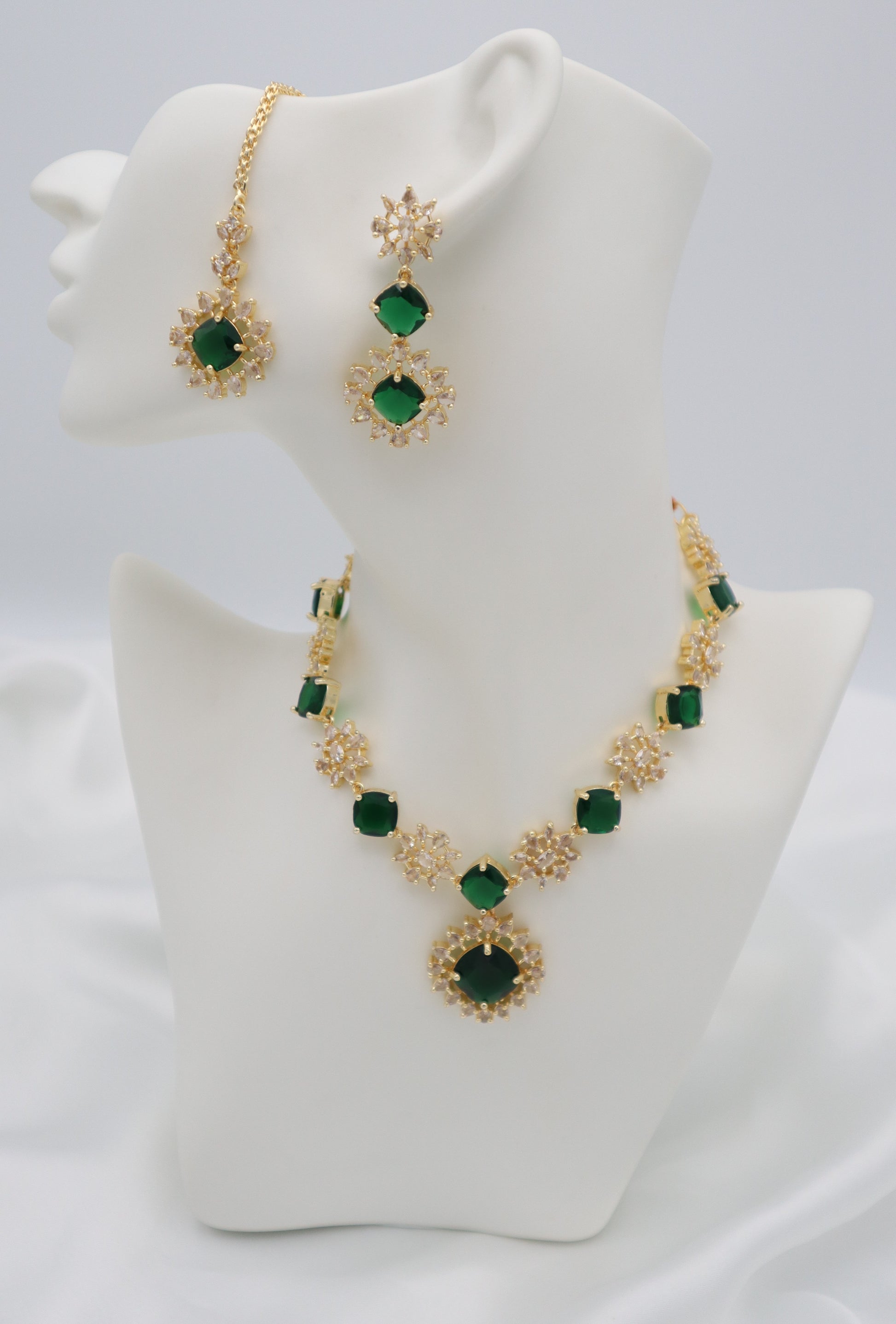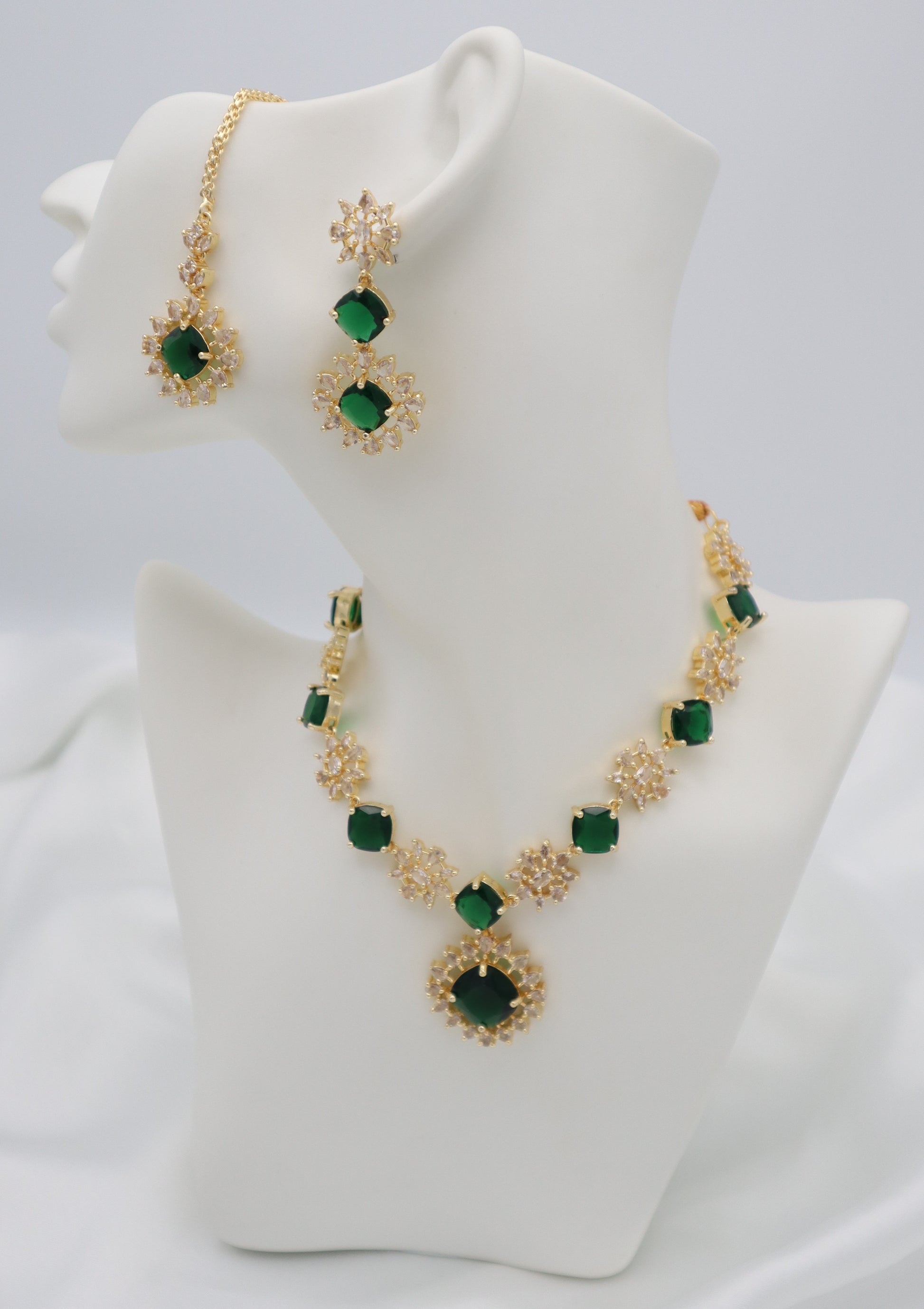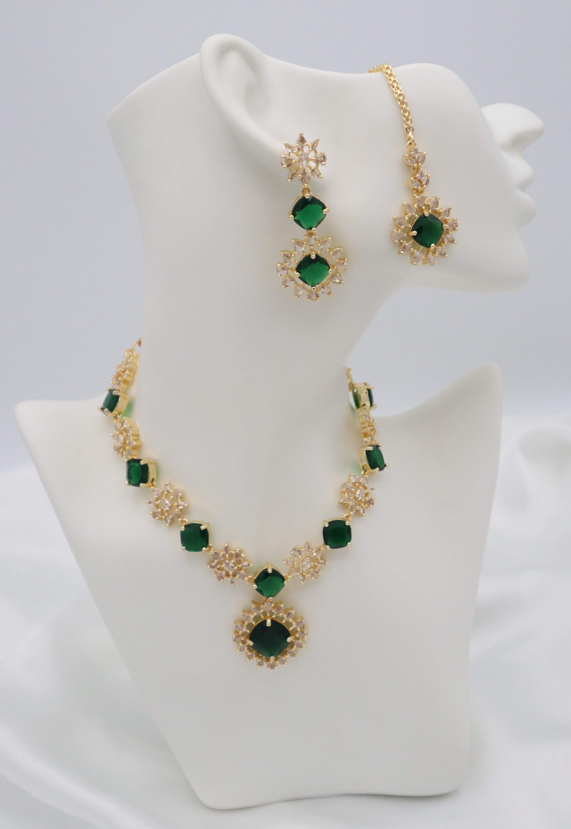 • Design: Alternating pattern of emerald-colored square stones and floral motifs, with a larger central pendant featuring a prominent green stone surrounded by a floral design.