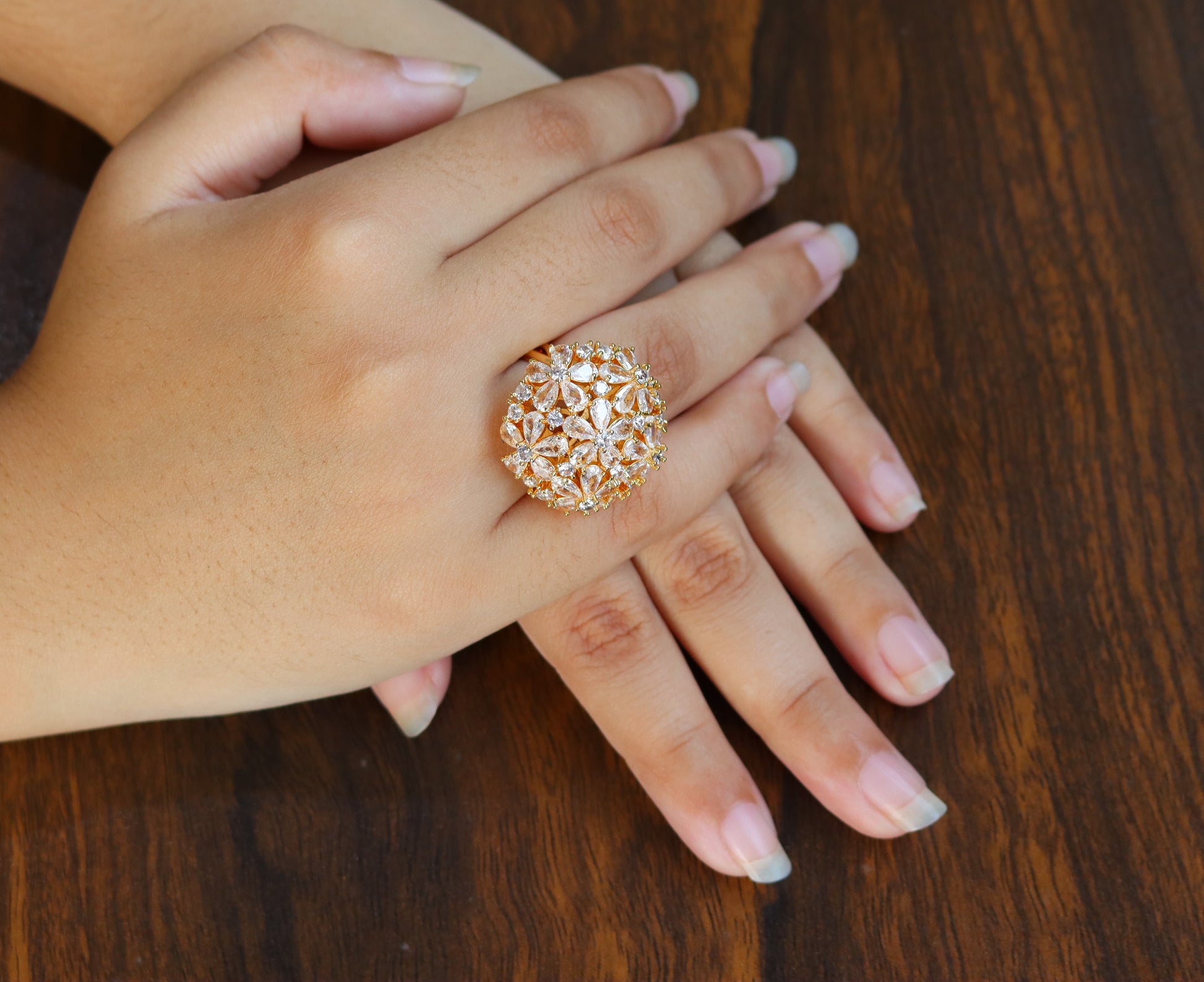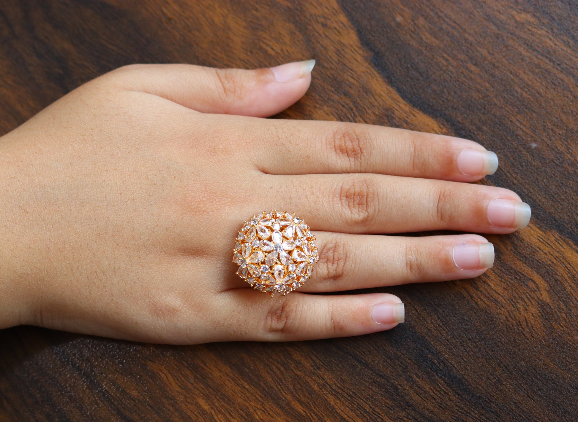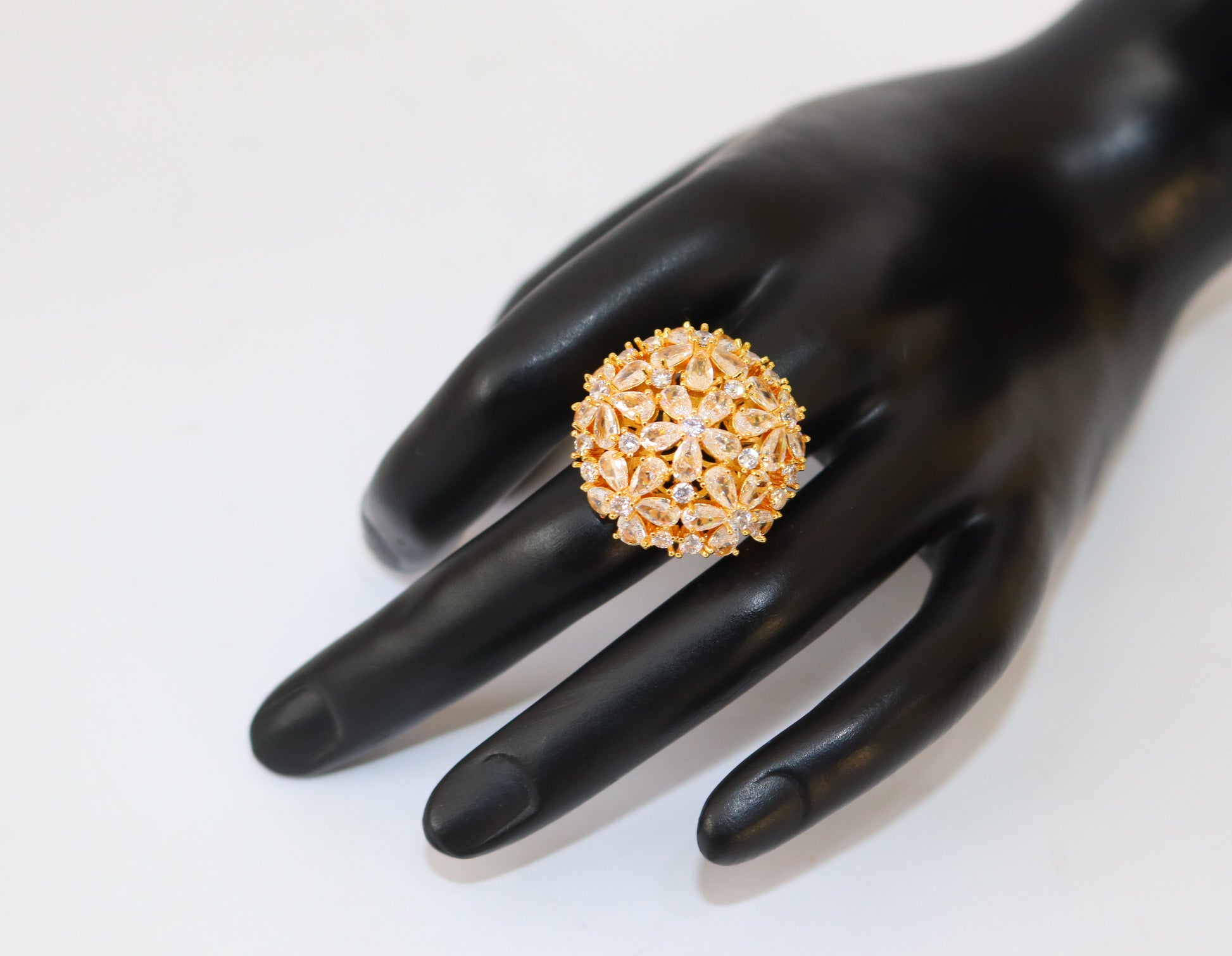 • Center Stone: The ring does not feature a single center stone. Instead, it is adorned with a cluster of smaller stones arranged to create a dome-like appearance.