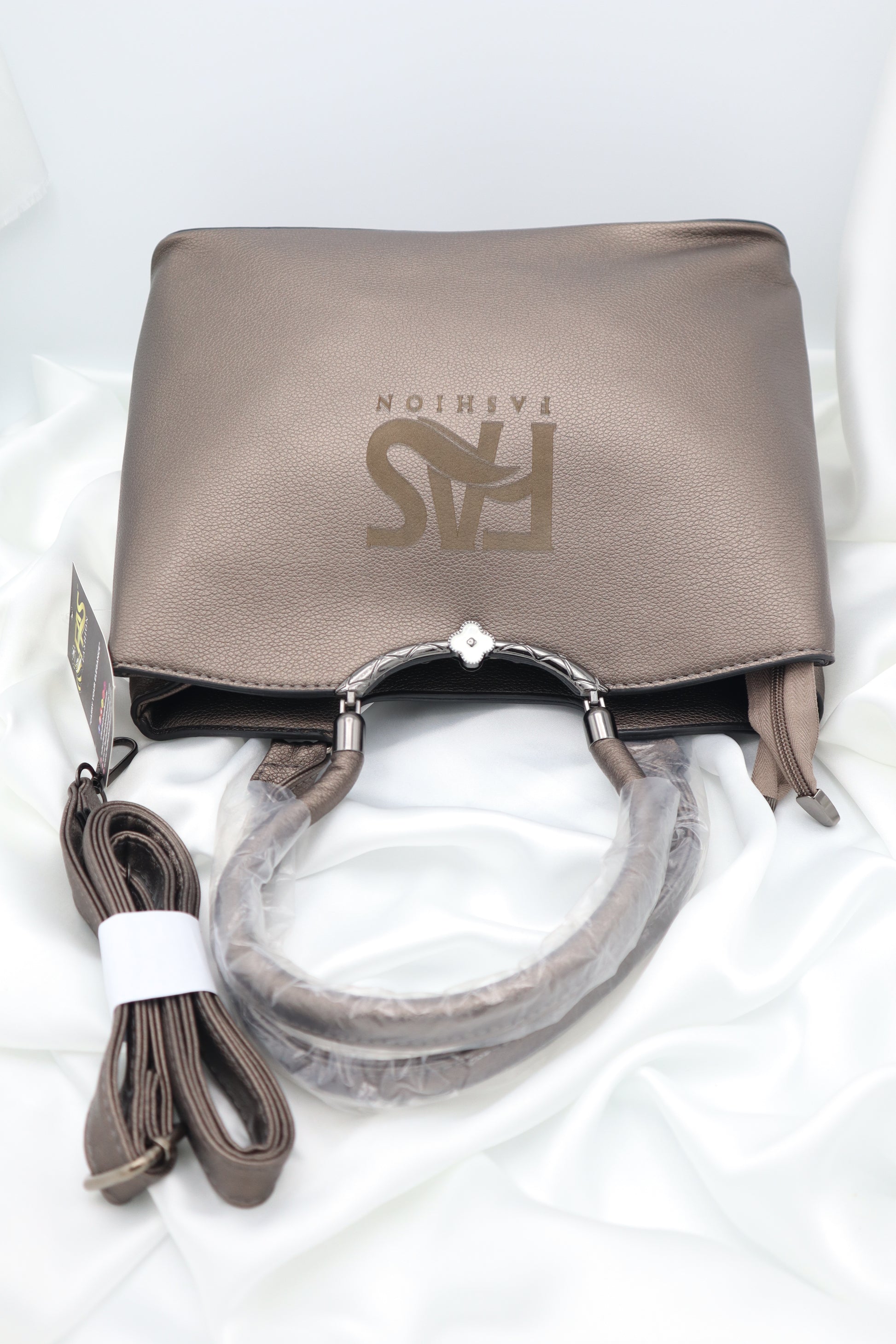 - This bag appears to have a short top handle with a metallic accent where the handle attaches to the bag.