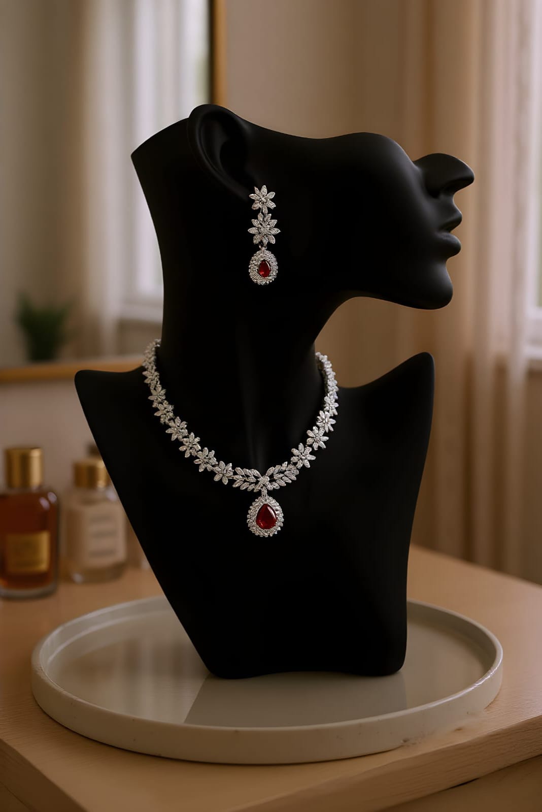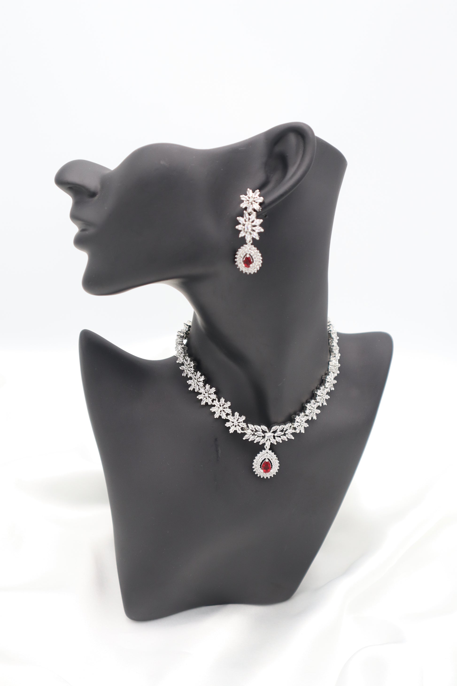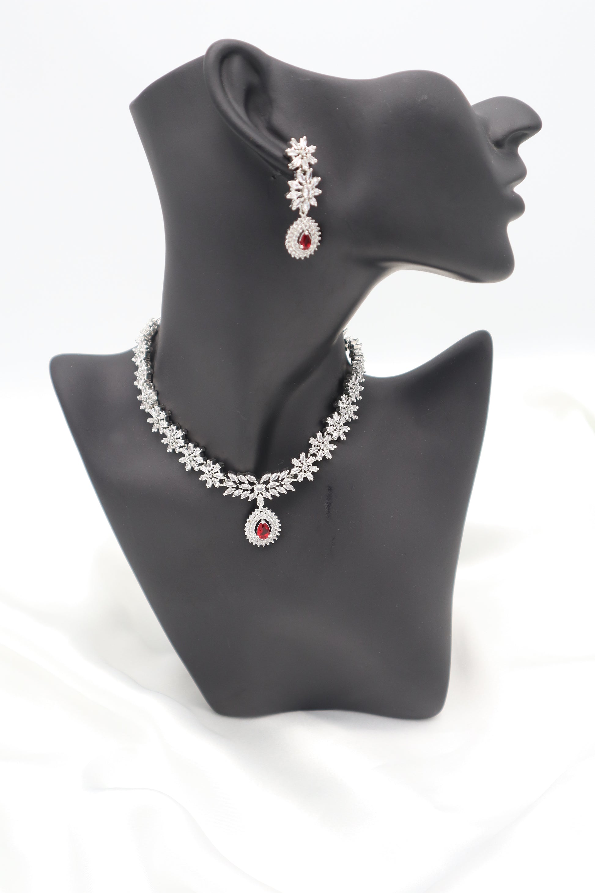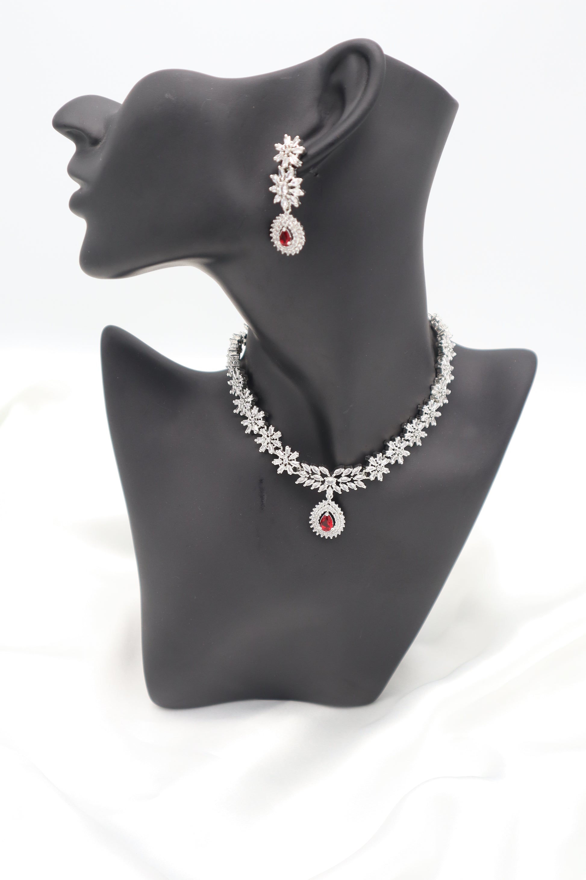 • Design: Collar-style necklace with a repeating floral pattern, featuring a large pear-shaped red stone surrounded by a halo of smaller stones as the centerpiece.