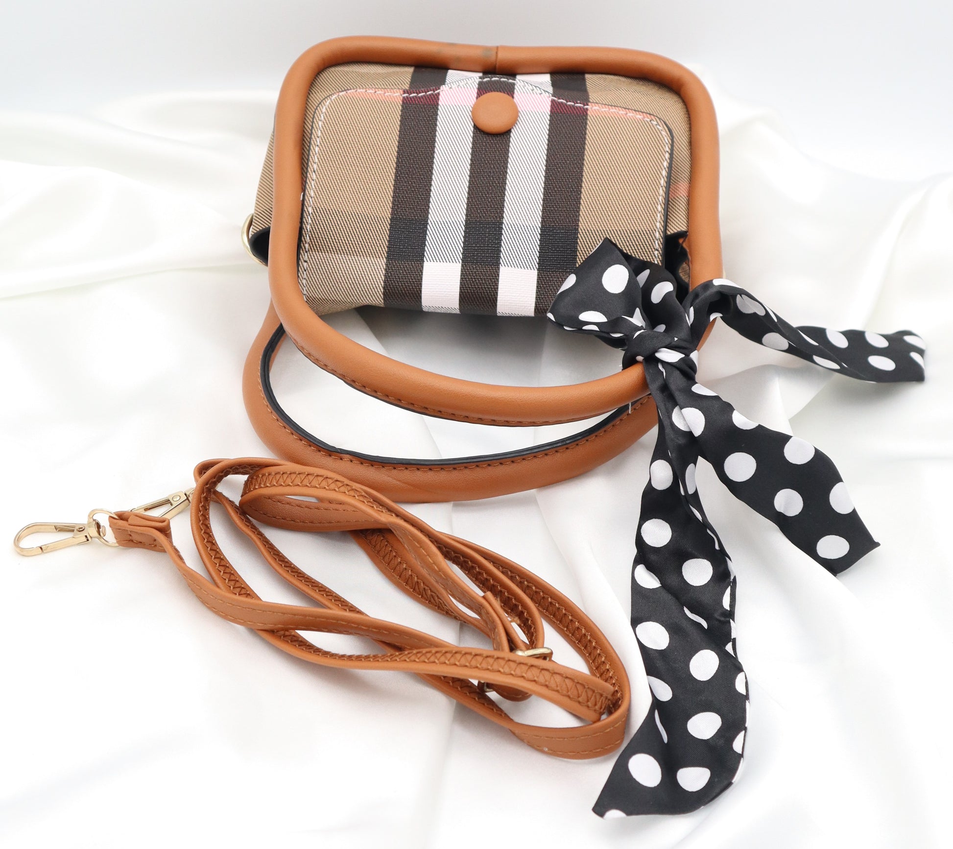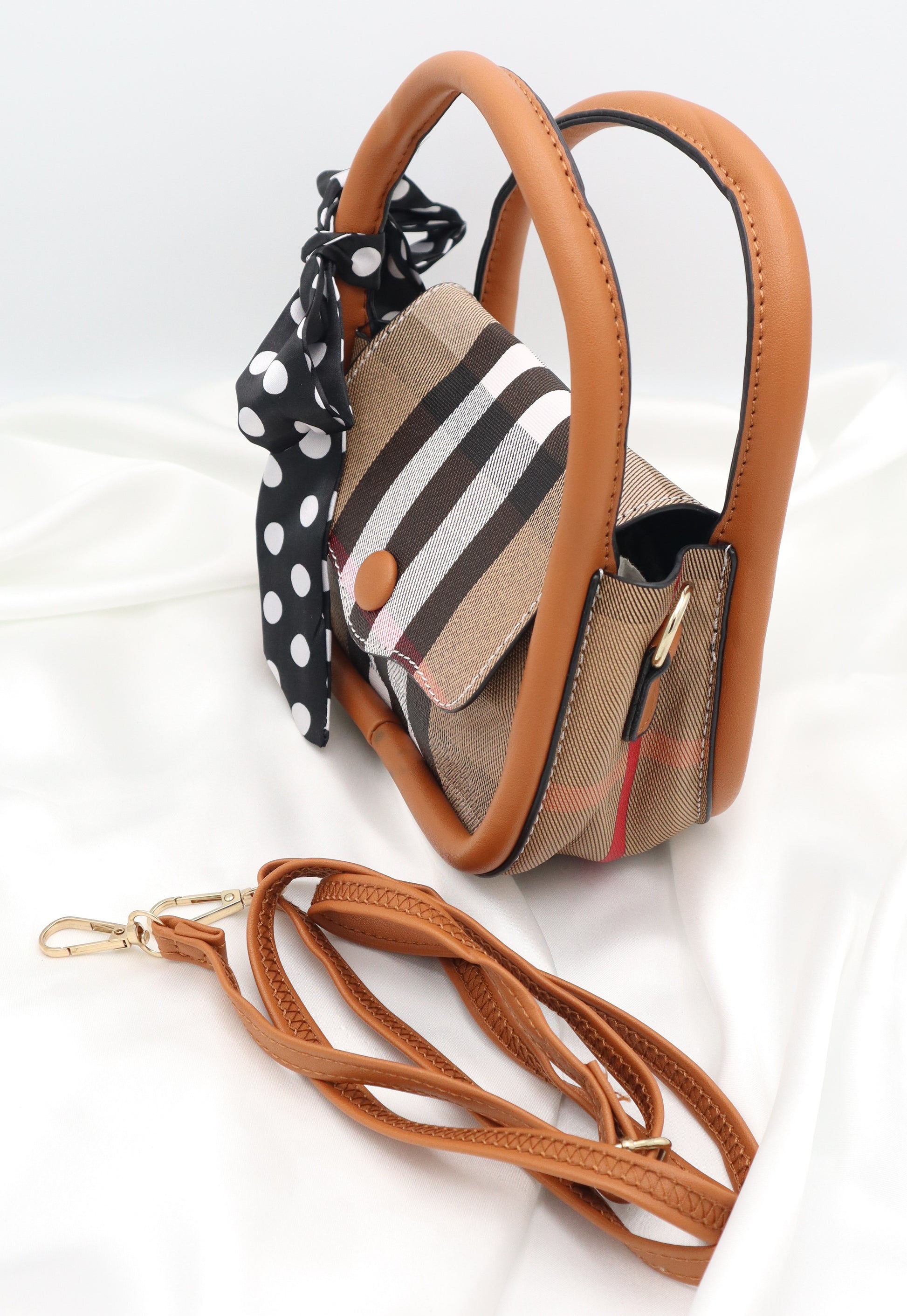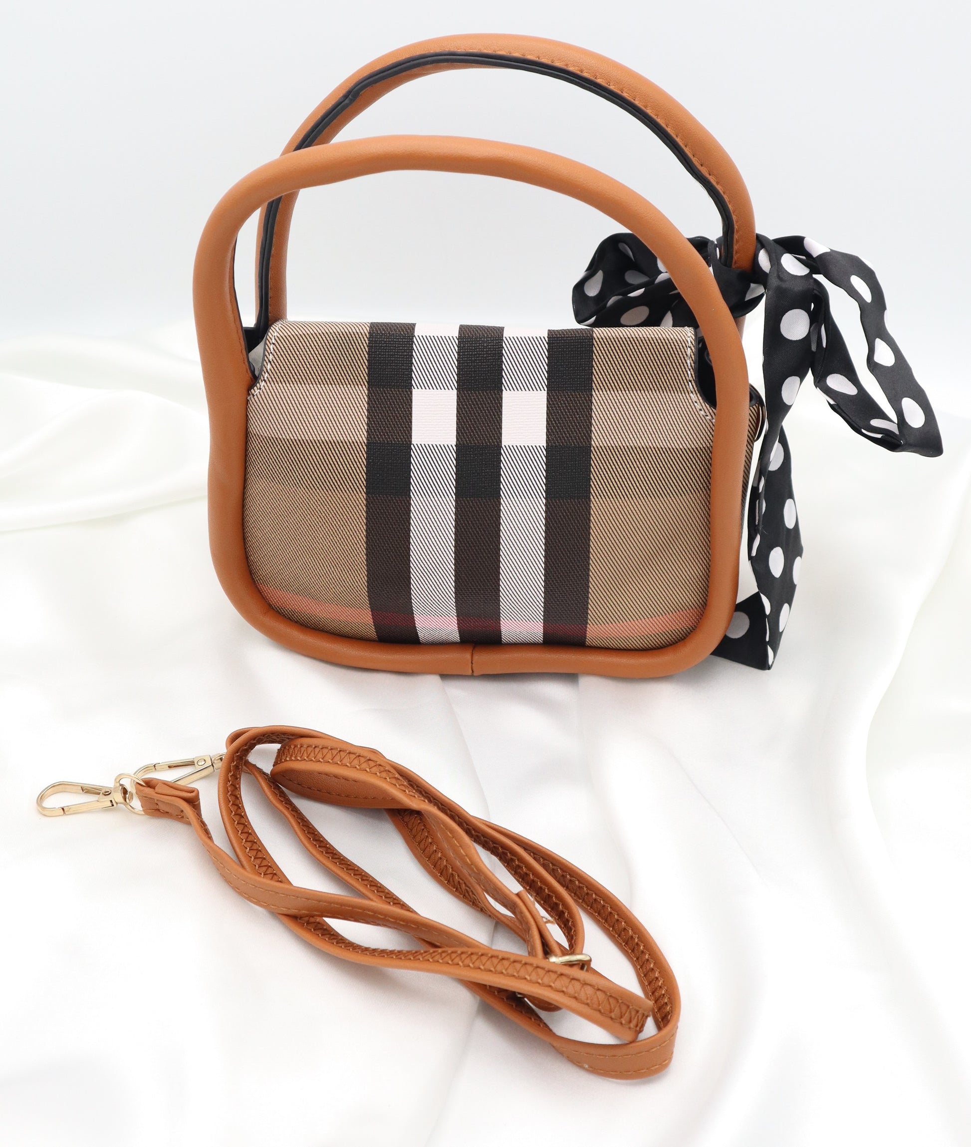 - A playful printed scarf tied to the handle, adding a pop of color.